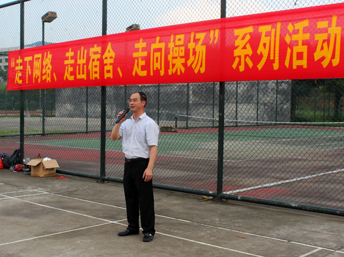 5月20日下午,“走下网络、走出宿舍、走向操场”三走系列活动在篮球场正式拉开帷幕,副校长赖小景出席了活动并宣布系列活动正式开幕。他表示,希望同学们通过参加此次比赛激发出锻炼身体的兴趣,希望参加比赛的社团积极分子能带动身边的同学走下网络、走出宿舍、走向操场。