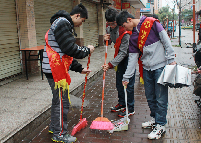 3月11日,我校13级应用电子二年制学生在商业街开展了志愿清扫活动。