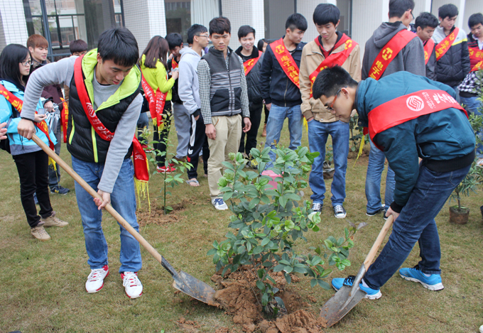 3月11日,我校13级楼宇智能化1班44位同学在叶绿野艺术楼前的草地上开展了以“追求绿色时尚,走向绿色文明”为主题的植树活动。