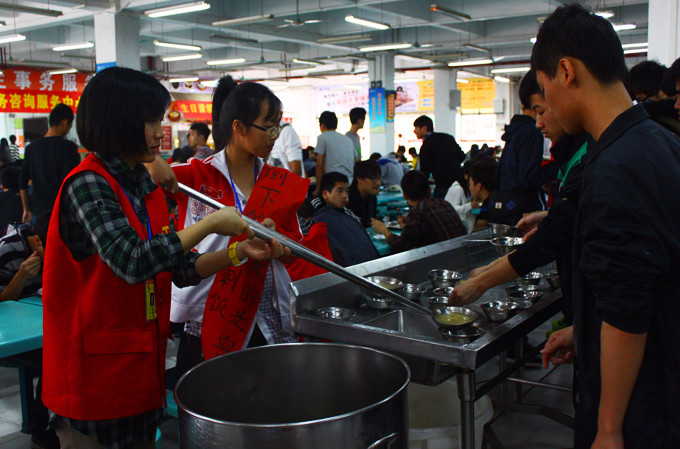 从开学第一天起,人文学院青年志愿服务队的志愿者们在学校A、C区食堂开展了以“我是光盘族,对浪费say no”为主题的“光盘”行动。活动中,志愿者手持形式各样的宣传标语,在食堂入口、就餐处,倡导学生积极参与到“光盘”行动中来,养成珍惜粮食,拒绝铺张浪费的良好行为习惯。