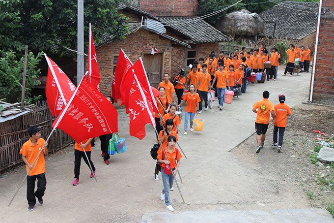早上,全体志愿者从学校中庭集中乘车前往紫金县凤安镇觉民村服务点,于9时30分在觉民小学操场举行以“实践铸就青春梦,奉献续写南粤情”为主题的暑期“三下乡”实践活动启动仪式。我校团委书记陈海明、觉民村村委书记曾永光、觉民小学校长张威林、“三下乡”指导老师以及全体志愿者、觉民小学学生参加此次仪式。