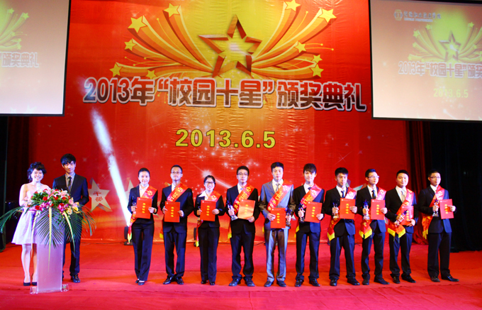 6月5日,我校于学术报告厅隆重举行了2013年“校园十星”颁奖典礼。魏芳、黄游逵、罗源、巫贵浩、陈懋勋、吴亨宇、刘芳芳、黄志强、张伟丰、林杰鸿等十人成为当晚最闪亮的十颗明星。