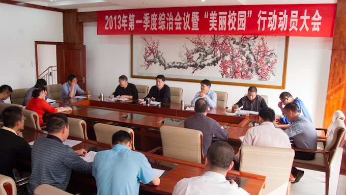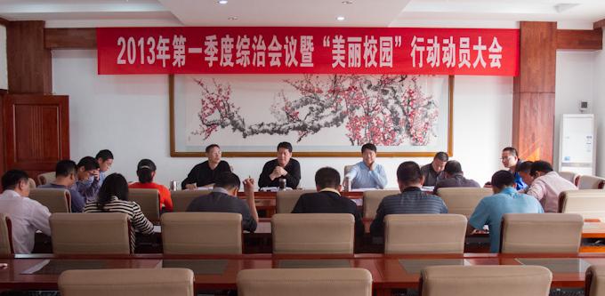 3月13日下午,我校2013年第一季度综治会议暨“美丽校园”行动动员大会召开。刘安华校长强调要培养大家的校园文明意识,共同为建设美丽校园而努力。