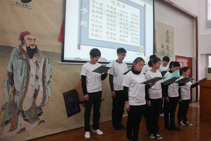记者在修心讲堂现场看到,讲堂内容丰富,参与性强,气氛热烈,分八个环节进行,分别是唱一首歌《爱的奉献》、诵读一段经典《弟子规 泛爱众》、学一点礼仪(问候礼仪)、看一部短片《因为爱,所以爱》、讲一个故事《爱心之星 龙美萍》、作一番点评《奉献爱心,爱满校园》、作一个承诺《与奉献同行 让爱心永驻》。