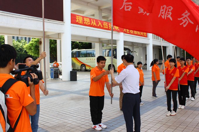 最后,赖小景副校长与戴春平院长一起为“三下乡”各服务队队长授志愿服务旗,全体志愿服务队员将于仪式结束后奔赴服务点进行“三下乡”社会实践活动。