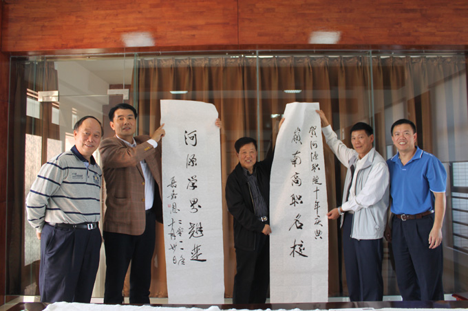 现场,聂嘉恩为我校题写一副对联:“岭南高职名校,河源学界翘楚”。我校党委书记高仁泽、副校长陈德清以及专员刘守义等到场观摩,并与聂嘉恩进行亲切交流。