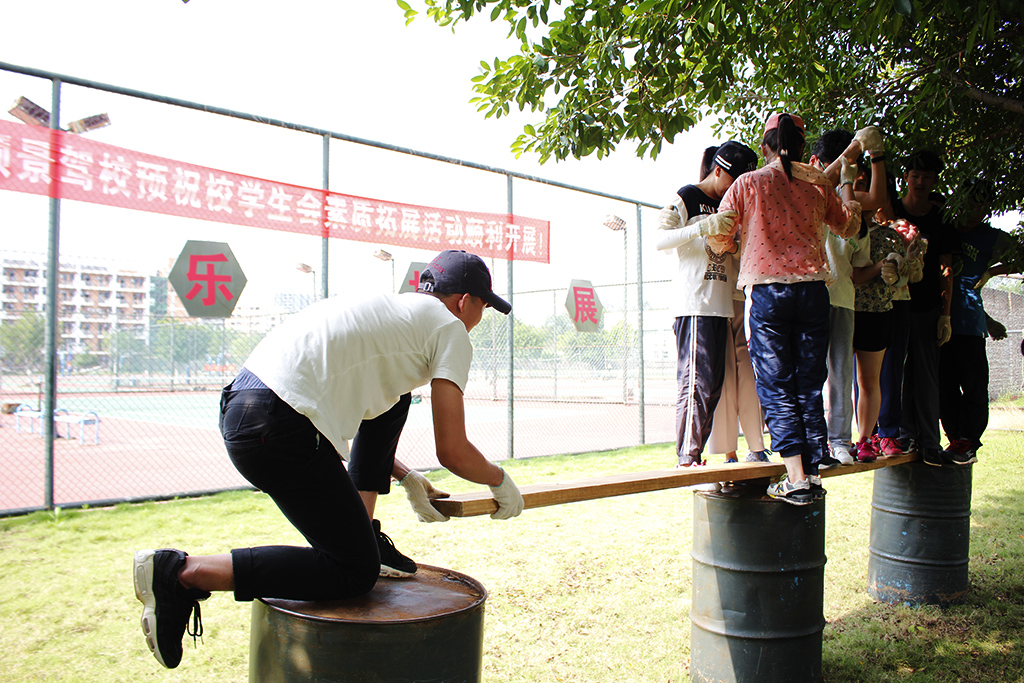 在全体人员拍照合影留念后,学生代表们分成两个小组以饱满的精神和充沛的体力投入到训练中。无论是考验信任度的背摔、毕业墙,还是考验团结合作的雷阵、穿越沼泽,都充分展现我校青年学生朝气蓬勃的面貌和团结友爱的精神。
