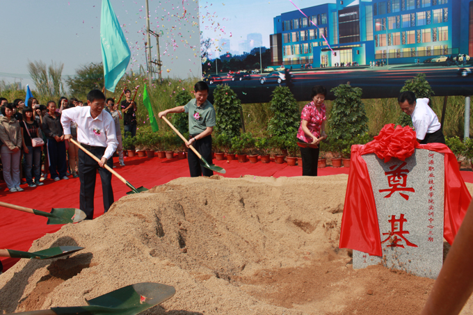我校党委副书记韦荣在奠基仪式上介绍了实训中心三期项目的情况,他表示该项目开工建设,是我校发展史上的一件具有里程碑意义的大事。该项目是我校按照“政府主导、校企合作、师生经营、服务社会”理念推进生产性实训基地建设的一个成功实践,标志着我校建设及我市职业教育发展的又一新起点、又一新高度。黄建中、叶维园及我校领导班子等共同为实训楼三期铲土奠基。
