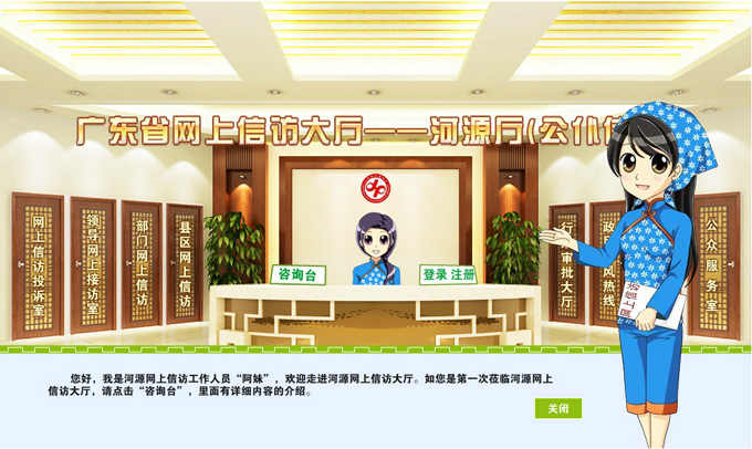 河源网上信访大厅是在河源市公仆信箱的基础上升级的,是集网上信访、手机信访、电话信访、网友互动等多位于一体的网上信访大厅。大厅设有网上信访投诉室、领导网上接访室、市直部门网上信访、县区网上信访、手机电话信访服务室、公众服务室、政风行风热线、行政审批等系统。