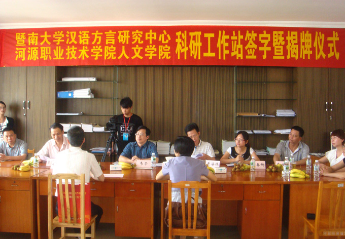 在揭牌仪式上,韦荣副书记首先致辞。他说,暨南大学汉语方言研究中心mksports官方网站登录入口科研工作站落成对我校开展客家方言调查研究以及客家历史文化的研究提供了极大的便利,对河源地区的客家方言调查与研究具有深远意义,并要求主要承担此工作的人文学院能借科研工作站落成的契机在客家方言研究等方面提升科研水平。接着,甘于恩教授致辞。他简要地介绍了暨南大学汉语言方言研究中心的研究方向和学科建设等相关情况,并希望今后进一步加强与我校的合作,开展对河源地区方言资源研究和应用。之后,人文学院院长黄海林和暨南大学汉语方言研究中心主任甘于恩教授共同签署《暨大汉语方言研究中心与mksports官方网站登录入口人文学院关于联合建立mksports官方网站登录入口科研工作站的协议书》,并为该科研工作站揭牌。最后,暨南大学汉语言方言研究中心的专家与我校人文学院的教师座谈,并向我校赠送有关方言著作一批。