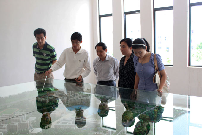 我校校办有关人员为来访领导介绍学校建筑规划图