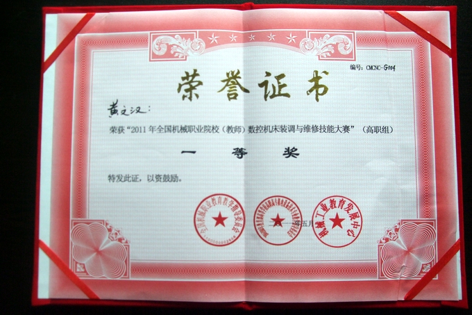 5月20日至24日,2011年全国机械职业院校(教师)数控机床装调与维修技能大赛在浙江举行,我校黄文汉老师荣获全国一等奖,为学校争得荣誉。