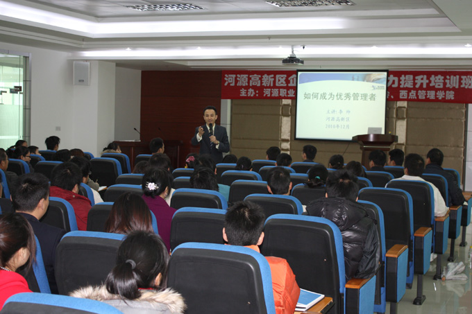 12月16日,我校与高新区管委会、西点管理学院联合举办的高新区企业精英管理能力提升班在高新区孵化器二楼学术报告厅举行。培训班吸引了高新区企业人力资源部门经理、培训主管等近100人参加。