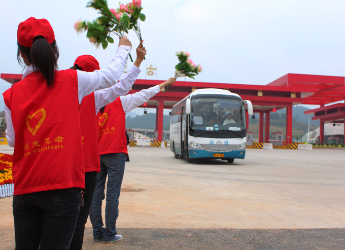 “热烈欢迎参加世界客属第23届恳亲大会的毛里求斯福禄寿客家联谊会的嘉宾。”28日上午9点整,乘车服务队指引小组在粤赣高速路口迎来了当天的第一批客人。