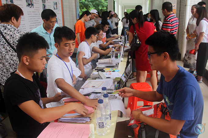新生在报到处办理入学手续