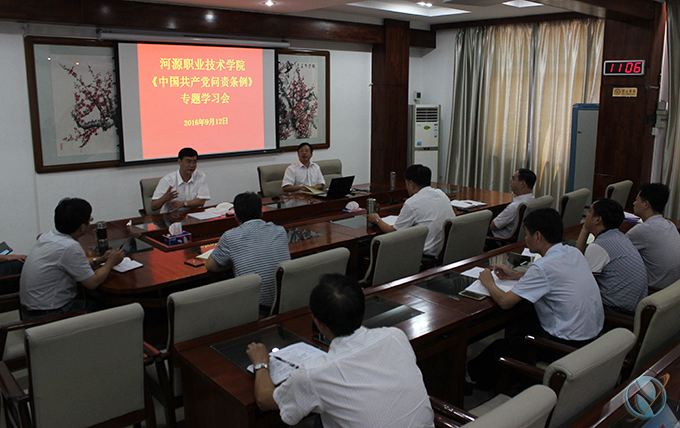 (学生文字记者:刘欣瑜)9月12日,我校于行政楼第一会议室开展《中国共产党问责条例》专题学习会。会议共认真学习了13条问责条例,明确了《中国共产党问责条例》依据中国共产党章程为从严治党之利器。党委书记段邦贤、校长陈德清、副校长唐汉芳、陈农心、赖小景、王小宁等校领导出席本次学习会,各处室、院部负责人参会。韦荣副书记主持本次会议。