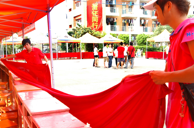 在A区学生宿舍楼下,一个个红色的大帐篷接连扎起,据现场志愿者介绍,届时,这些大帐篷搭起的临时工作会场,将会为新生提供报名注册、咨询等帮助。同时,教学楼A栋1楼的校医室,正在加紧时间准备新生体检的相关工作,据悉,河源市中医院和河源市同济医院的医生将会在10号至13号期间,为我校新生提供入学体检工作。