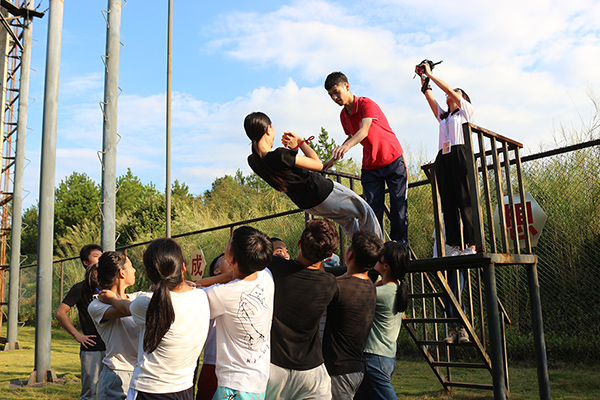 在全体人员拍照合影留念后,学生干部代表分成两个小组以充沛的精力投入到素质拓展训练中。在“穿越沼泽”和“雷阵”训练项目中,考验了学生干部的团结合作的能力;“背摔”和“攀爬毕业墙”项目则考验了学生干部之间的信任度,每个项目的训练都充分展现了我校青年学生积极向上的态度。