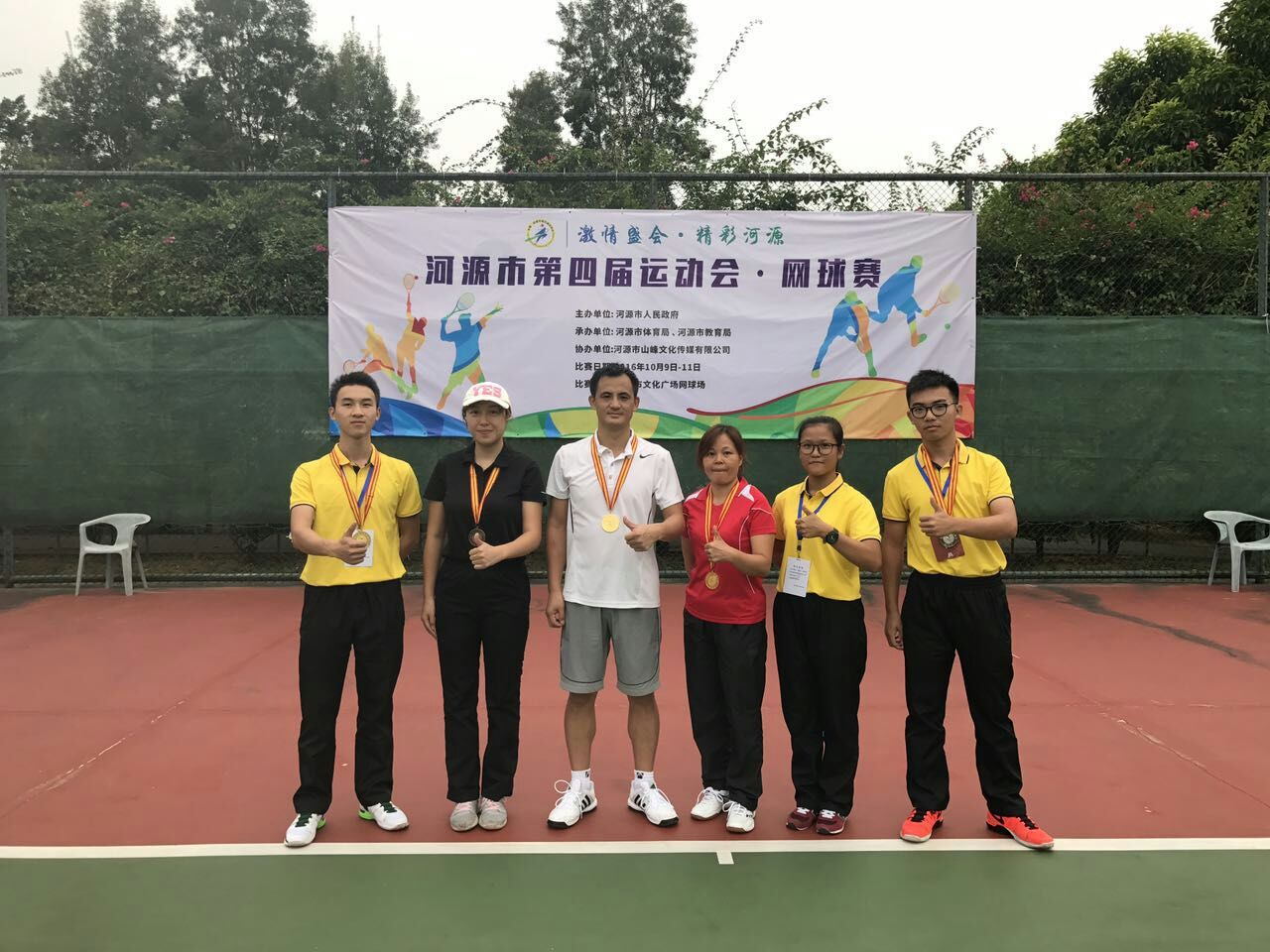 我校网球、乒乓球、羽毛球和篮球在河源市第四届运动会均取得佳绩。在网球比赛中,黄智誉老师荣获男子单打和混双冠军,肖微老师和蔡平英老师分别获得女子单打第三名和第五名。在兵乓球比赛中,谢振明老师荣获男子单打冠军、男双冠军和团体赛第三;曲建国老师荣获男双冠军和团体赛第三;刘冠军老师荣获团体赛第三。在羽毛球比赛中,王国华老师荣获双打冠军和团体赛冠军;刘迪梅老师荣获双打亚军和团体赛冠军。在篮球比赛中,张原平老师和杨日奎老师所在的宣教文卫线队荣获第三名。在足球比赛中,古伟民老师参与源城区代表队,荣获团体比赛第一名。