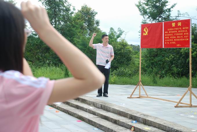 活动现场,在我校党委组织部门相关负责人宣读新党员名单后,全体党员在纪念碑前,面向鲜红党旗,举右手齐肩握拳,向党旗庄严宣誓。