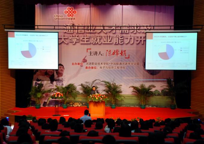 为让我校师生了解通信行业的前沿及就业前景,6月9日,我校邀请了中国联通广东省分公司资深专家陈婵娟教授以及联通公司副总经理朱华先生到我校,开展“通信人才需求以及大学生就业能力开发”的学术报告。校长刘安华、副校长陈德清、学工处处长以及联通公司相关负责人出席了此次报告会。