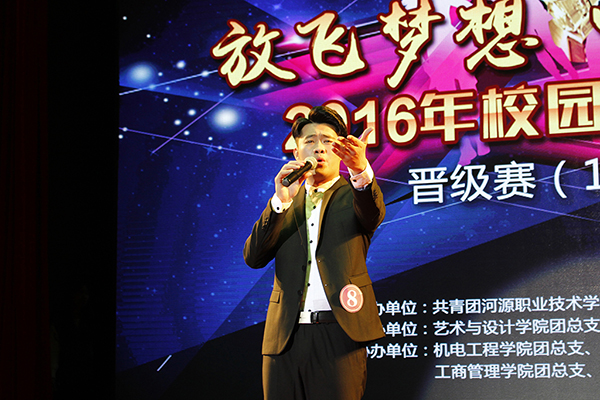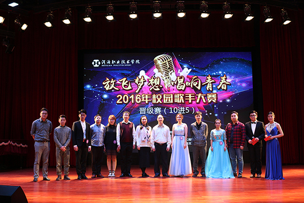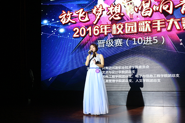 (校团委通讯员 黄志远 学生文字记者 陈玉棱 )11月3号晚,我校在艺术楼演播厅举行以“放飞梦想,唱响青春”为主题的2016年校园歌手大赛十进五晋级赛。副校长赖小景、宣传部部长杨海燕、校团委书记陈晓峰、艺术与设计学院负责人杜伟祥、音乐教育专业主任梁山、音乐表演专业主任刘颂章等相关领导、老师担任了此次评委。经过了激烈的角逐,黄嘉军、单晓欣、王县基、李希博、赵悦童5名选手凭借过硬的实力进入总决赛。