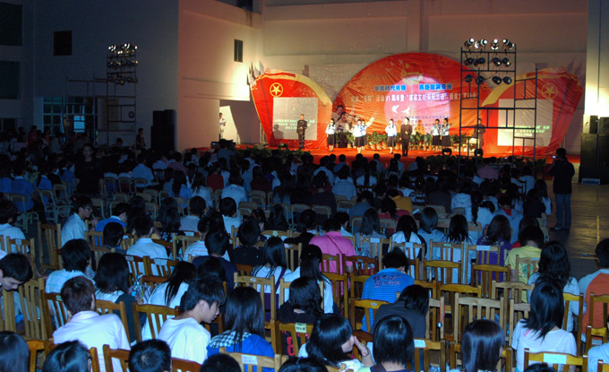 五月的蓓蕾,飘摇在青春的枝头。五月的春风,吹拂着年轻的脸庞。为迎接第23届世界客属恳亲大会与广州亚运会的到来,4月29日,我校在风雨操场隆重举行以“争当时代先锋,喜迎世客亚运”为主题的纪念“五四”运动91周年暨“客家文化采风活动”颁奖文艺晚会。校长刘安华、副校长陈农心、学工处、团委相关负责人、各学院团总支书记及学生代表、共青团河源市第五次代表大会全体代表、少先队河源市第三次代表大会全体代表出席了此次活动。