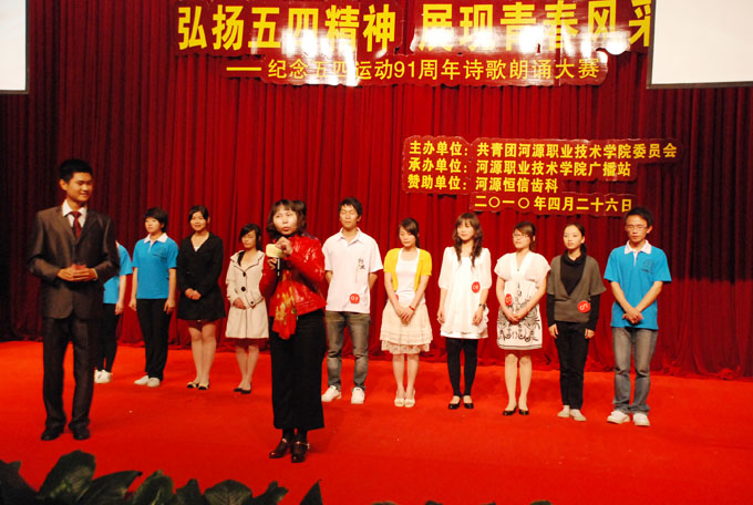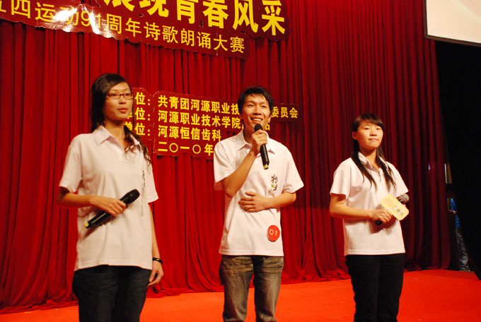 鲜花开满五月,五四精神日益常新,为纪念五四爱国运动91周年的到来,4月26日,我校以“弘扬五四精神,展现青春风采”为主题的诗歌朗诵大赛在学术报告厅顺利举行。学工处、校团委相关负责人、各学院团总支书记、河源恒信齿科院长汪佩生及部分学生代表参加了此次比赛。