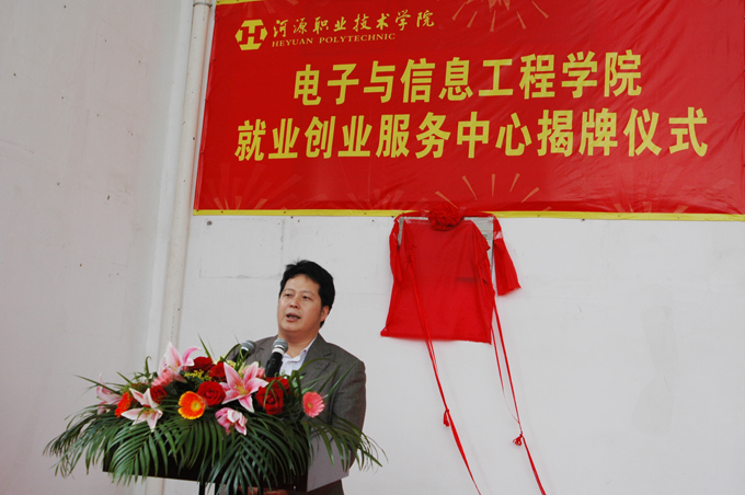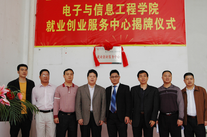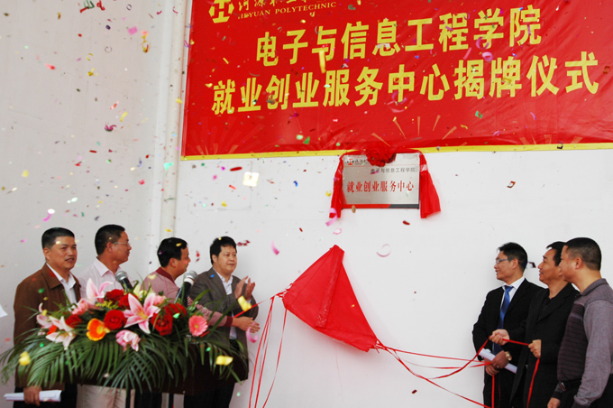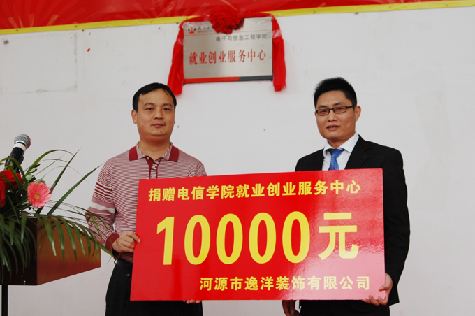 随后,学校领导和嘉宾共同为“电信学院就业创业服务中心”揭牌。据悉该学院就业创业工作得到了企业与用人单位的大力支持和帮助,其中,首批“就业创业服务中心”基金由河源市逸洋装饰有限公司捐赠。