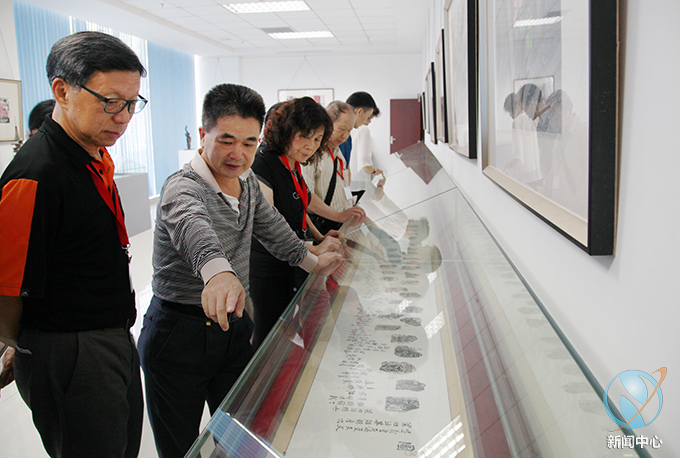 恳亲团一行首先到我校学术交流中心参观何健生和张其彬历史图片展以及骆文冠艺术展。在参观图片展时,唐汉芳详细地为众人介绍两位河源籍英雄人物的光荣事迹——“民族脊梁,客家豪杰”何健生与“大漠壮士,航天翘楚”张其彬,并获得在场人员的肯定与高度评价。接着,恳亲团一行人移步至骆文冠艺术展,唐汉芳作讲解。