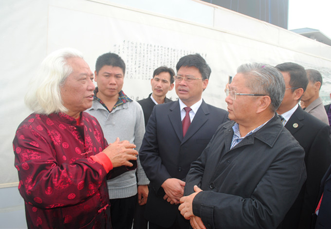 市政协副主席梁国华等领导嘉宾为画展揭幕。《东江百里图》以东江为对象,骆文冠先生从江西境内的源头起笔,取三百山、连平桃花、和平新城、林寨古村、霍山、龙川县城、佗城古镇、万绿湖、红色紫金、深圳等景色入画,将两岸山水和客家民俗风情表现在一幅长卷上,画面恢宏,技法精湛,令观众啧啧称奇。
