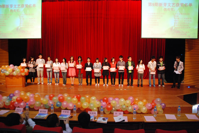 会上,学工处处长首先肯定了新芽文学社在学校起到的积极作用,认为新芽文学社是构建和谐校园当中不可缺少的一支队伍,为快速构建校园文化、丰富学生生活起到了领头羊的作用。同时,他希望,新芽文学社能明确定位,办出属于高职院校的特色,在筛选稿件环节能严把质量关,争取再上新台阶。随后,他为第八、九期《新芽文艺》获奖的同学进行颁奖。