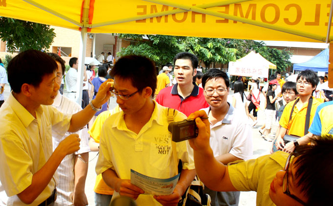 学校党委书记高仁泽在现场亲自为新生检测体温,并到家长休息区慰问新生和家长。高书记在视察中总结了此次迎新工作的三大特点:一、我校在防控甲流措施上做了充分的准备工作。二、今年我校向外省正式招生,吸引了众多外省学子的就读。三、我校今年将实现由千人校园向万人校园的跨越。万人校园的实现,将标志着我校在办学质量、教学效率、教务管理等方面都有质的飞跃,同时也将是整个河源教育体系的一个提升,这不仅将实现我校初期的目标,且给予起初对我校教学抱怀疑、担忧心态的河源市民一个满意的交待。