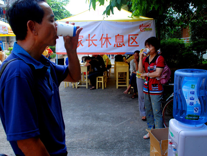 新生家长正在享受学校提供的优质泉水