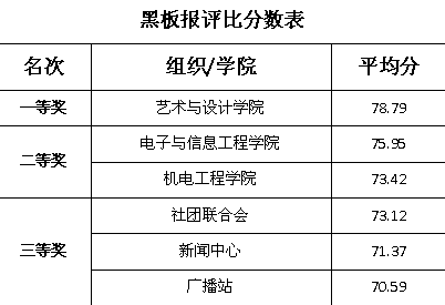 此次黑板报评比由各学生组织、二级学院的学生干部代表组成的评审组,秉承黑板报评比规则,本着公正、公平、公开的原则,从内容、版面设计、文字抄写、刊头、提花、小标题、解读六个方面分别对每幅黑板报进行了评比。在评比过程中,各学生组织、二级学院学生代表认真解说,对各自所设计的黑板报刊头、版面设计、图案构思、色彩搭配以及内容等方面进行详细讲解,与此同时,各学生组织、二级学院学生代表在讲解中虚心采纳了评委组的意见及建议。最终经评分统计,艺术与设计学院以平均分78.79荣获一等奖。