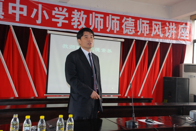 讲座上,陈副校长在阐述我国师德现状和我市中小学教育现状时导出“教师道德素养的教育功能”。他利用大量贴近生活的案例,简明扼要的分析了当代教师的人格、品性、德操对学生人格的形成起着奠基作用;教师良好的职业道德对学生思想品德的形成和学业的发展起着催化和激励的作用。他指出,道德体现于习惯,习惯体现于细节,教师应培养优良的心理品质,形成良好习惯。他强调,教师走向成功必备的第一心态是热情主动;教师形象塑造的基本要求是端庄大方;教师礼仪修养的基本要求是规范得体;教师走向终身发展的基本原则是不断更新。