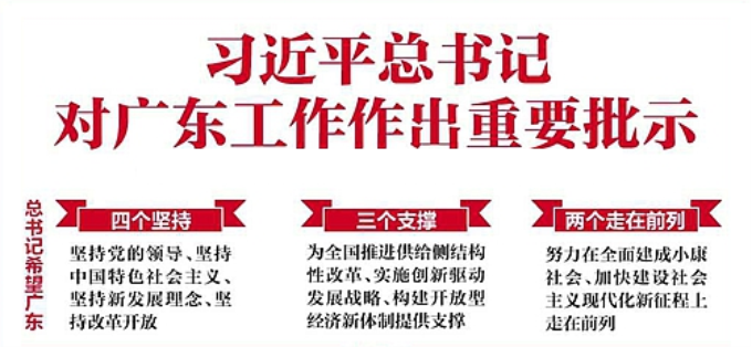 习近平总书记对广东工作重要批示中提出的“四个坚持”、“三个支撑”、“两个走在前列”,这是习近平总书记治国理政新理念新思想新战略在广东的具体化,具有十分重大而深远的指导意义。习近平总书记的批示充分肯定党的十八大以来广东各项工作,希望广东总结经验、明确方向、发挥优势、弥补不足,在新起点上再创新局面。