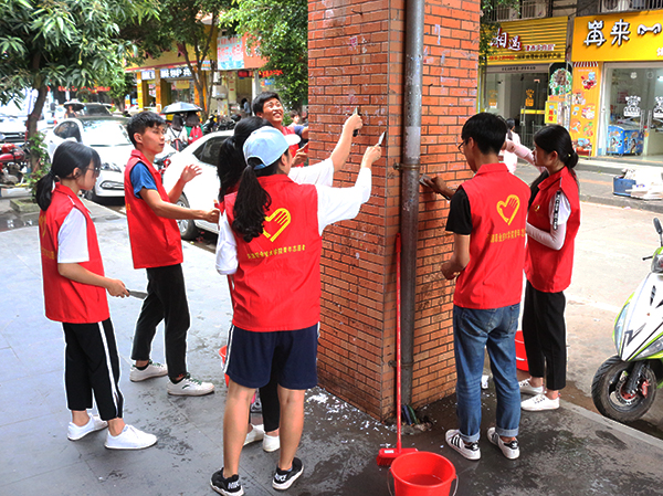在活动中过程,领导老师与志愿者们充分发扬团队协作精神,明确分工、干劲十足、相互协助、配合默契,采用撕、泡、刮、擦、等多种方法认真仔细地清除墙壁上的违规喷印和电线杆上各类小广告。经过一个多小时的清理,商业街环境有了显著的改善。