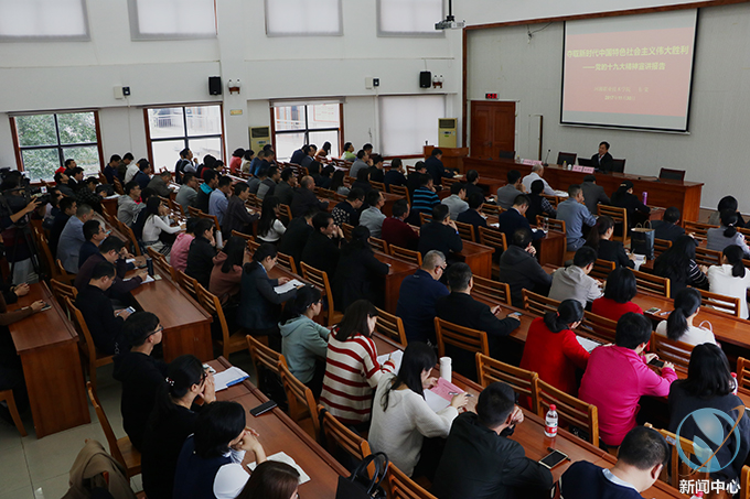 韦荣从党的十九大主题和主要成果、习近平新时代中国特色社会主义思想、过去5年历史性成就和历史性改革、中国特色主义进去新时代、我国社会主要矛盾的变化、“两个一百年”奋斗目标的战略部署、我国经济社会发展重大战略部署、坚定不移推进全面从严治党等八个方面对党的十九大报告进行了全面、详实的解读。