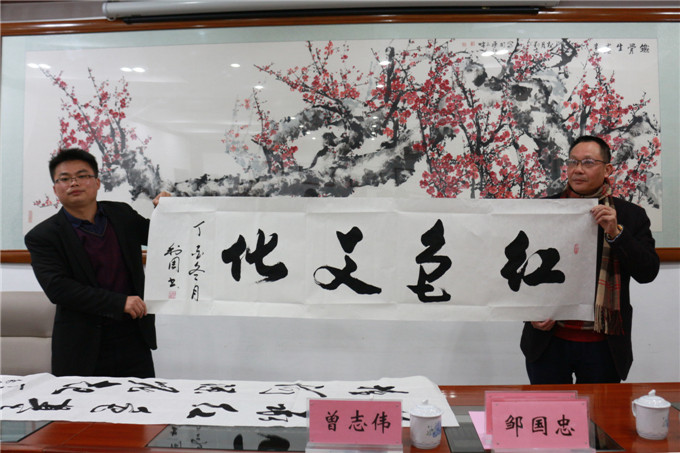 会议最后由深圳市书法家协会副主席杨利周现场赠送书法作品,这种机会很是难得,杨利周副主席挥毫泼墨,潇洒天成,先后写了“传承红色基因,助推河源崛起”“红色文化”“红色紫金”“抱朴守掘”“志存高远”等条幅,遒劲有力,力透纸背,全场气氛又达到了一个新的高潮。