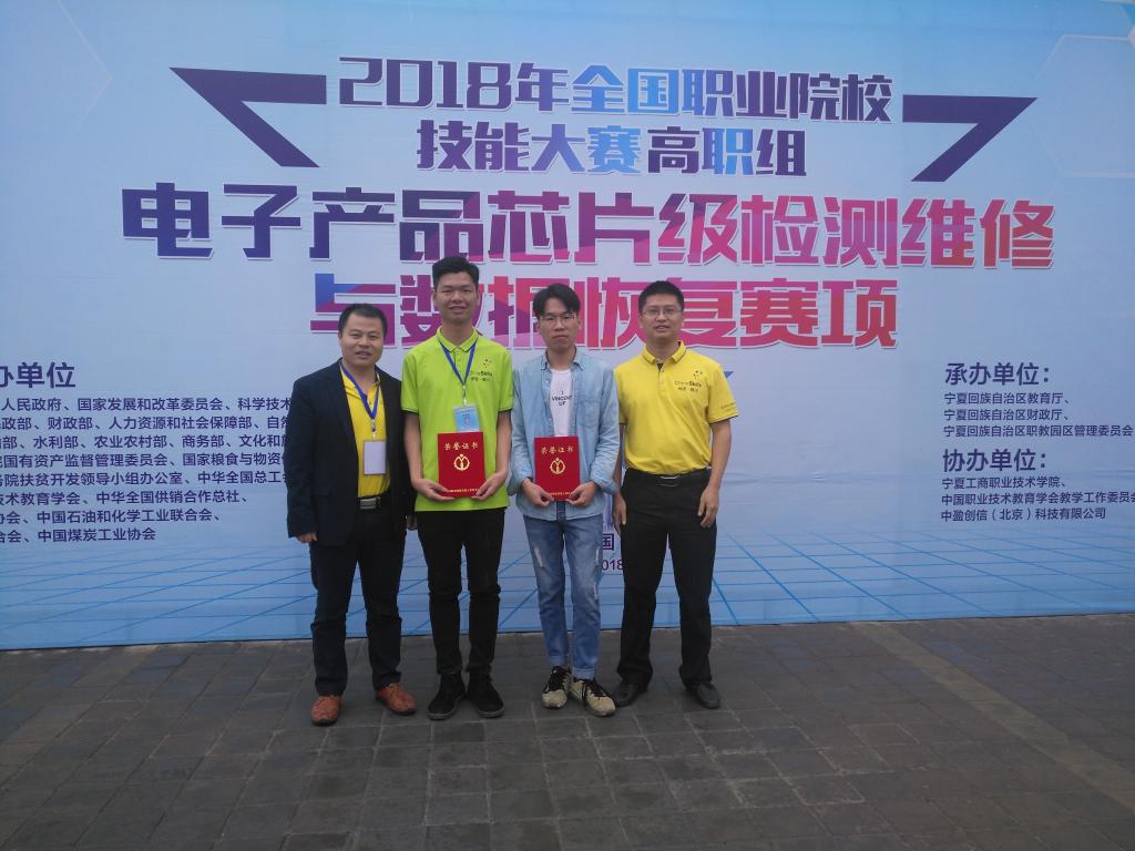 5月9日,2018年全国职业院校技能大赛 “电子产品芯片级检测维修与数据恢复”竞赛在宁夏工商职业技术学院举行。我校15级电子信息技术专业周嘉明、卢家铭同学发挥出色,荣获国家二等奖1项的优异成绩。