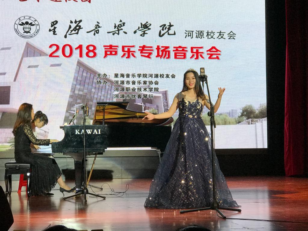 一曲《峡江情歌》为此次音乐会拉开序幕,2011年毕业于星海学院的李伟健,他的歌声让大家感受到阿妹对幸福生活的憧憬和淳朴阿哥的情真意切,也传达出作曲家对于这片土地的深厚情谊。古往今来,黄河以其雄壮的气势,奔腾在中国大地上,滋养着一代又一代中华儿女。候鑫歌唱的《黄河颂》,是黄河的颂歌,是时代的颂歌,是中华民族的颂歌,是中华民族生生不息、坚忍不拔、永往直前的颂歌。黄丽梅的一曲《昭君》,把大气磅礴的浩瀚之势与婉约凄美的忧郁之情完美融合,让人们深刻感受到声乐作品带来的无限魅力。郑晓戈的《跟我走》、《我的太阳》,欧阳山《在那遥远的地方》、《山歌唱出好兆头》,许乃胜的《在那桃花盛开的地方》、《重归苏莲托》,蓝金利《七月的草原》,陈松林《我的爱人你可听见》、欧阳雪清《海风阵阵愁煞人》等校友悠扬的音乐回响耳边,动人的歌声萦绕现场。此次音乐会还有星海音乐学院河源校友从国外专门回到家乡的叶穗星,他给大家带来《我不再爱你》、《我的末日就在眼前》,同时邀请了《美丽的绿谷》词作者邹国忠,此曲创作于2012年,是一首表现客家古邑风情、词曲清新流畅、传唱知晓度较高的歌曲。“动人之音,莫大于情。”情为歌之魂,艺术学院刘颂章老师《那就是我》把自己从歌曲中感受到的东西真实地歌唱出来,给予歌曲生命的活力。最后所有演出嘉宾合唱一首《我爱你中国》,为整场音乐会画上完美音符。