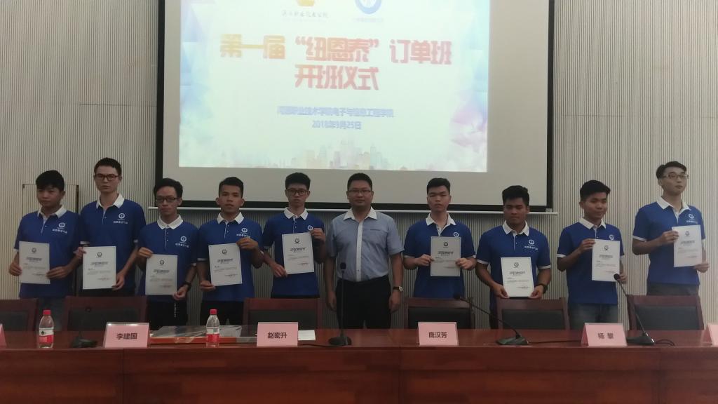 9月25日下午,我校与广东纽恩泰新能源科技有限公司(以下简称“纽恩泰”)共同举行“纽恩泰定向班”第一届开班典礼。参加人员有副校长唐汉芳、科研处处长邱远,纽恩泰董事长赵密升、副总经理李建国、人力资源中心总监蒋诗洋,电信学院院长杨黎以及第一届“纽恩泰定向班”的全体学员及师生代表。电信学院校企办主任黄舒主持开班仪式。