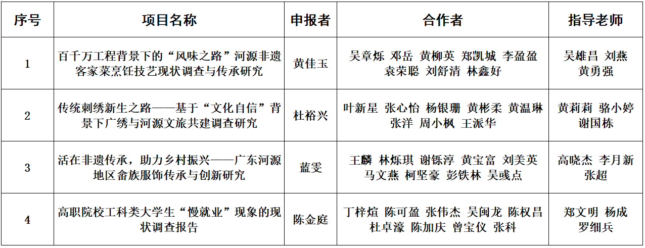 按照团省委、省学联《关于开展2024年广东省科技创新战略专项资金(大学生科技创新培育)项目申报的通知》工作安排,学校根据评审结果和意见,拟推荐《百千万工程背景下的“风味之路”河源非遗客家菜烹饪技艺现状调查与传承研究》等4个项目申报2024年度广东省科技创新战略专项资金(大学生科技创新培育),现将具体拟推荐申报项目名单(见附件)进行公示。