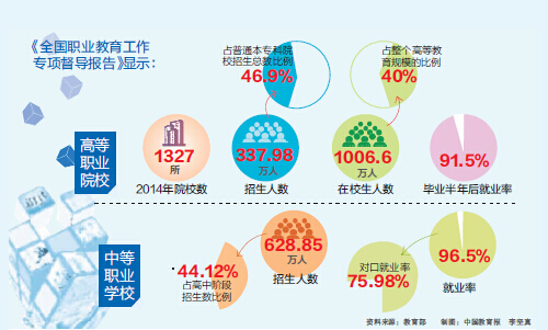 数据显示,2014年,全国高等职业院校1327所,招生337.98万人,占普通本专科院校招生总数的46.9%,比2013年增长5.8%,是“十二五”以来增长最快的一年。