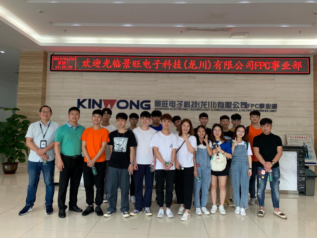 4月30日,景旺电子科技(龙川)有限公司的领导热情接待了我院师生。工程师们首先带领师生们参观了景旺电子的FPC事业部展厅,介绍了企业相关的专利成果、生产的主流产品及企业文化等内容。紧接着,带领师生们参观了FPC事业部软板的生产流程,讲解了软板从开料到生产出成品的整个生产流程。随后,在人事经理的安排下,进行了交流互动。