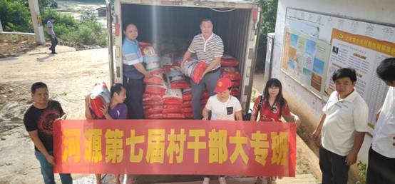 河源市第七届村干部大专班同学捐款22166元,并将善款全部采购成油、大米、米粉和水等灾区急需物资,由该班班长丘海全带领黄志玲、何雪英、何雄波、罗国文等同学将物资送往此次受灾的重灾区连平县上坪镇。