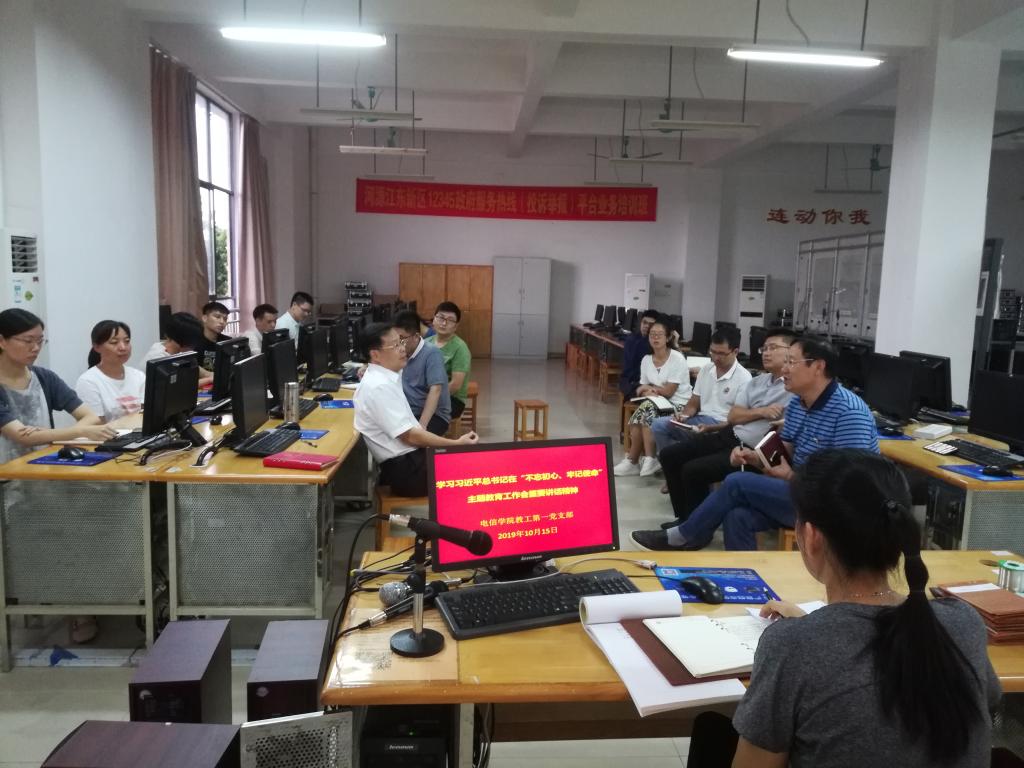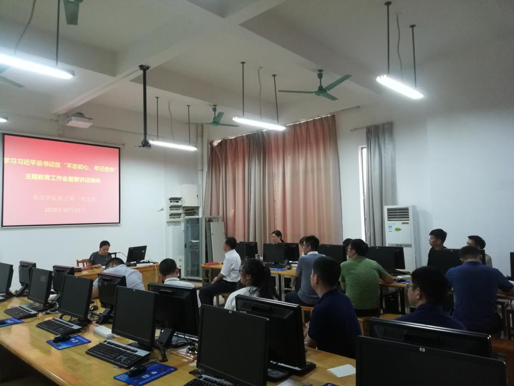 为了进一步推动学校“不忘初心、牢记使命”主题教育深入开展,对照《mksports官方网站登录入口关于开展“不忘初心、牢记使命”主题教育实施方案》,结合本支部实际情况,电信学院教工第一党支部于10月15日下午召开党员大会,共同学习习近平总书记关于“不忘初心、牢记使命”主题教育工作会议重要讲话精神。学校党委韦荣书记作为支部成员参会,电信学院教工第一党支部全体党员参加会议。