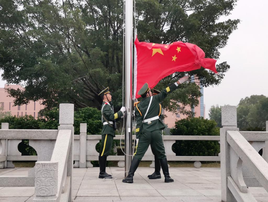 7点30分,国旗护卫队踏着铿锵有力的步伐准时出旗,伴随着《义勇军进行曲》的响起,升旗手振臂一挥,鲜艳的五星在全体师生的注目下,冉冉升起、随风飘扬。