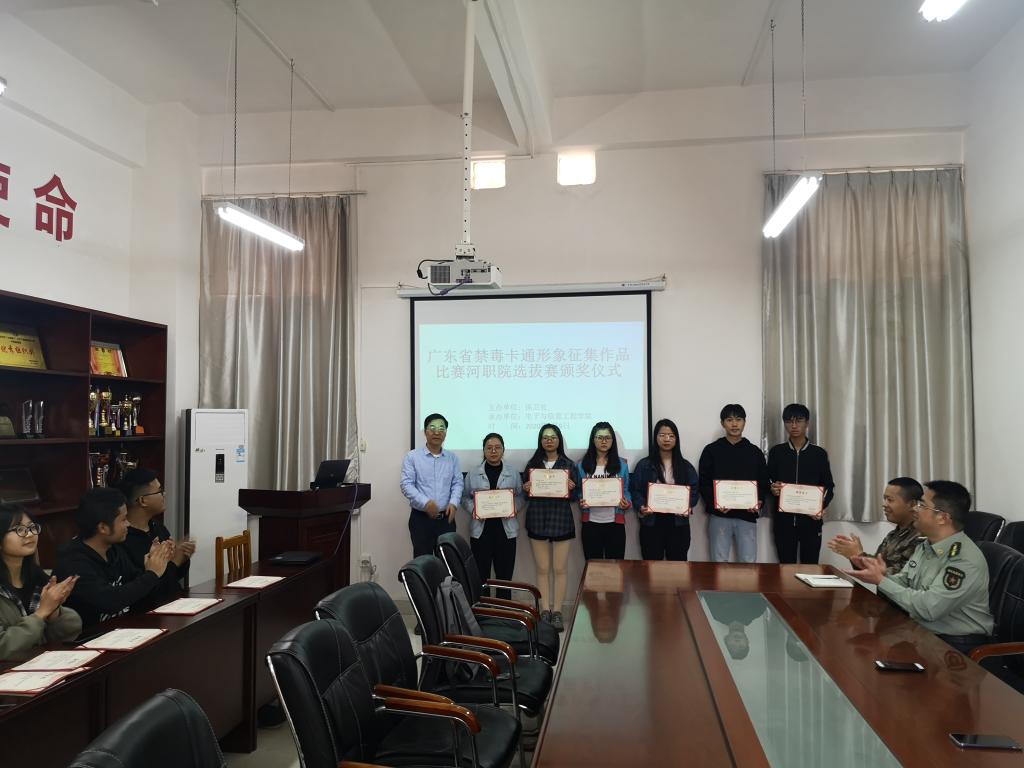 2020年1月9日,广东省卡通形象征集作品比赛河职院选拔赛颁奖仪式在电信学院B307举行。出席人员有:学校党委委员王小宁副校长、保卫处邓伟昌处长、电信学院王富宽院长、电信学院团总支书记杨日奎老师、保卫处黄旺庆老师、作品指导老师、获奖选手、工作人员。本次选拔赛由学校保卫处主办,电信学院承办,颁奖仪式由电信学院党总支副书记徐国辉主持。